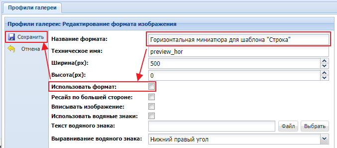 зайдите в формат "Горизонтальная миниатюра для шаблона "Строка"", дважды щелкнув по нем мышкой, установите галочку "Использовать формат" и нажмите "Сохранить". Скриншот