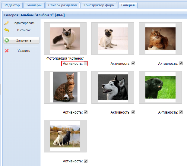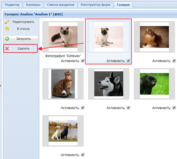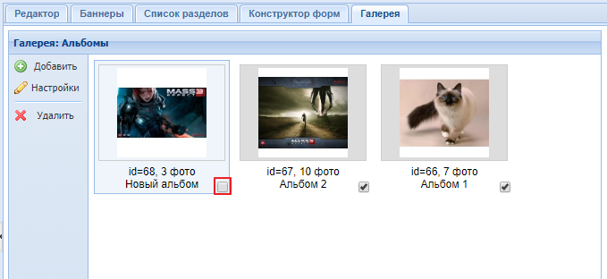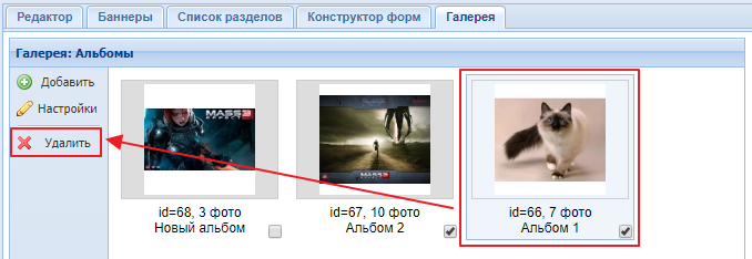 Если вы не хотите удалять альбом, но и не хотите, чтобы он выводился на сайте, вы можете его скрыть. Для этого уберите галочку, расположенную под наименованием альбома. Скриншот.