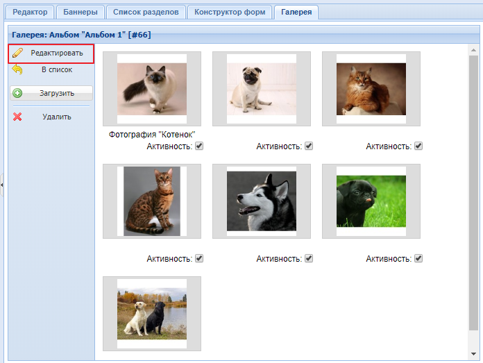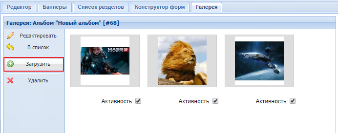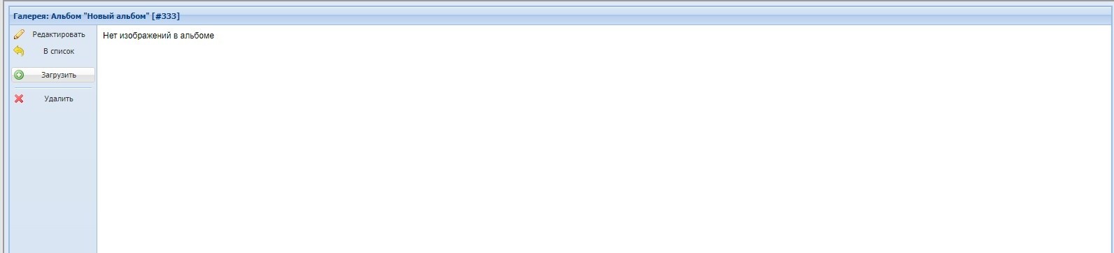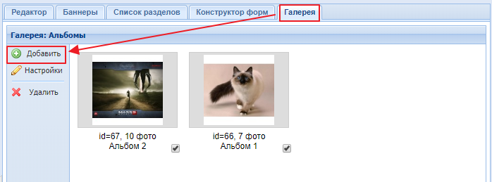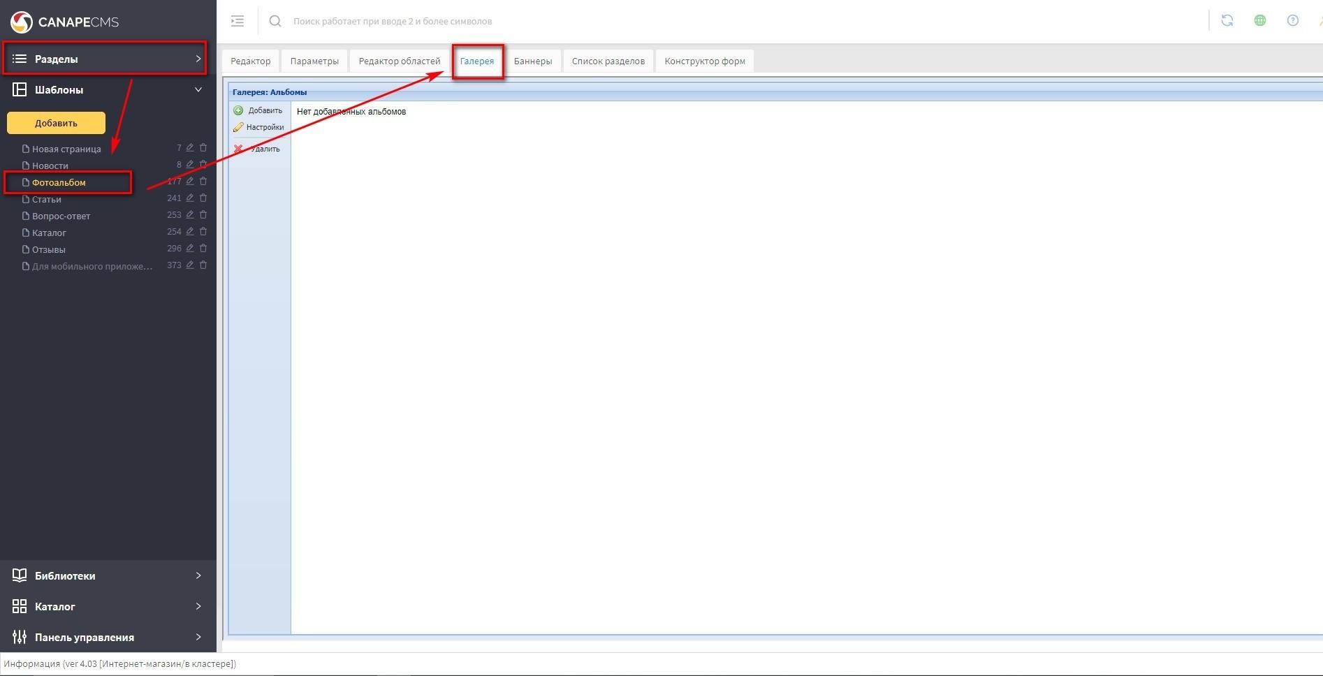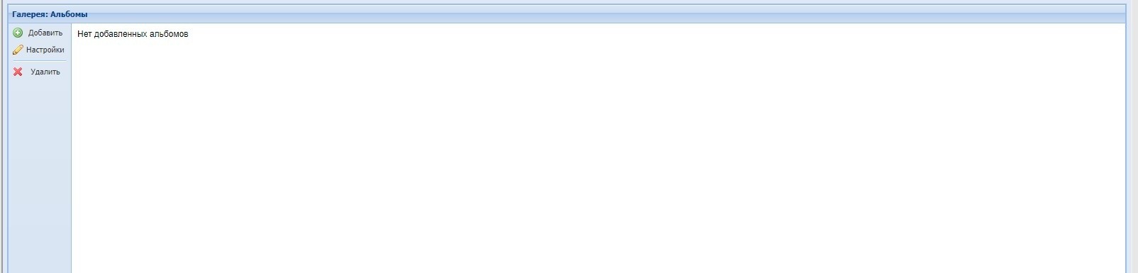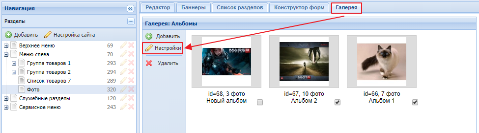 в панели "Разделы" найдите раздел типа "Фотоальбом", нажмите на него и в правой части откройте панель "Галерея". Скриншот