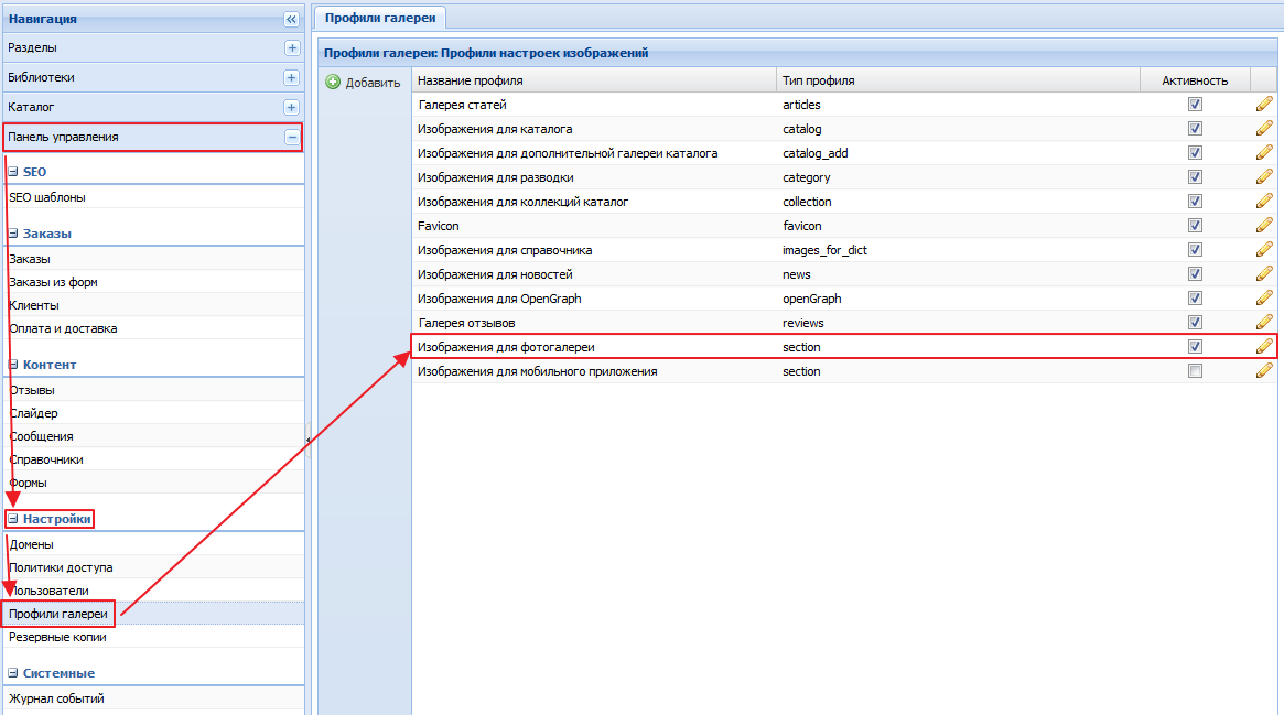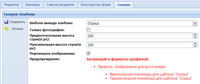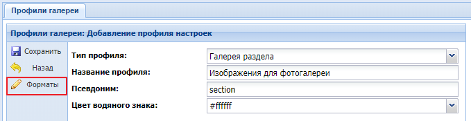 "Профиль галереи" - поле для выбора профиля галереи. По умолчанию стоит базовый профиль "Изображение для галереи".