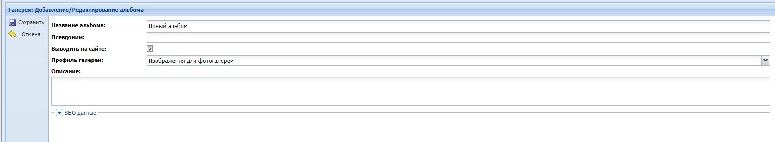 "Выводить на сайте" - поле типа галочка. При ее установке альбом выводится на сайте, если галочка отсутствует, то альбом не выводится. По умолчанию установлена.