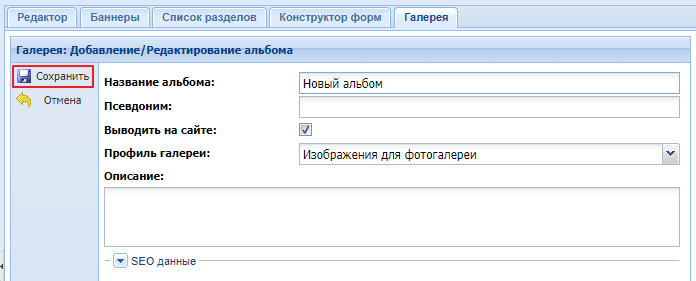 Кнопка "Сохранить" - при нажатии на нее происходит создание альбома