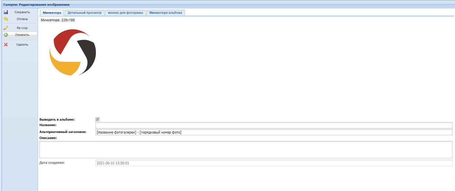 поле "Дата создания" - поле, в котором указывается дата и время загрузки изображения. Поле не редактируемое.