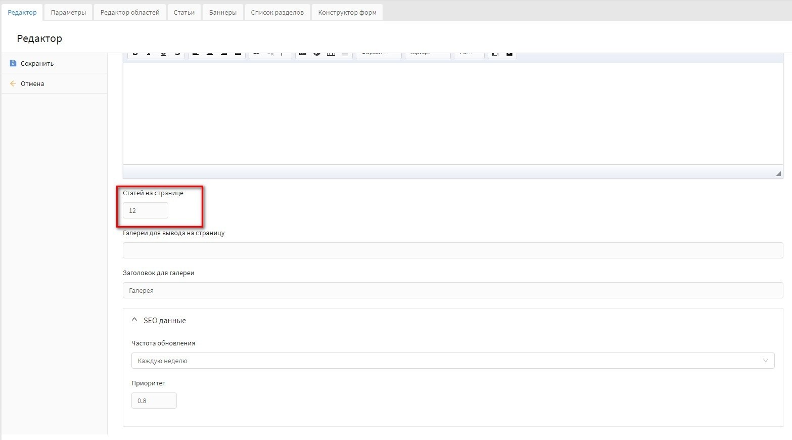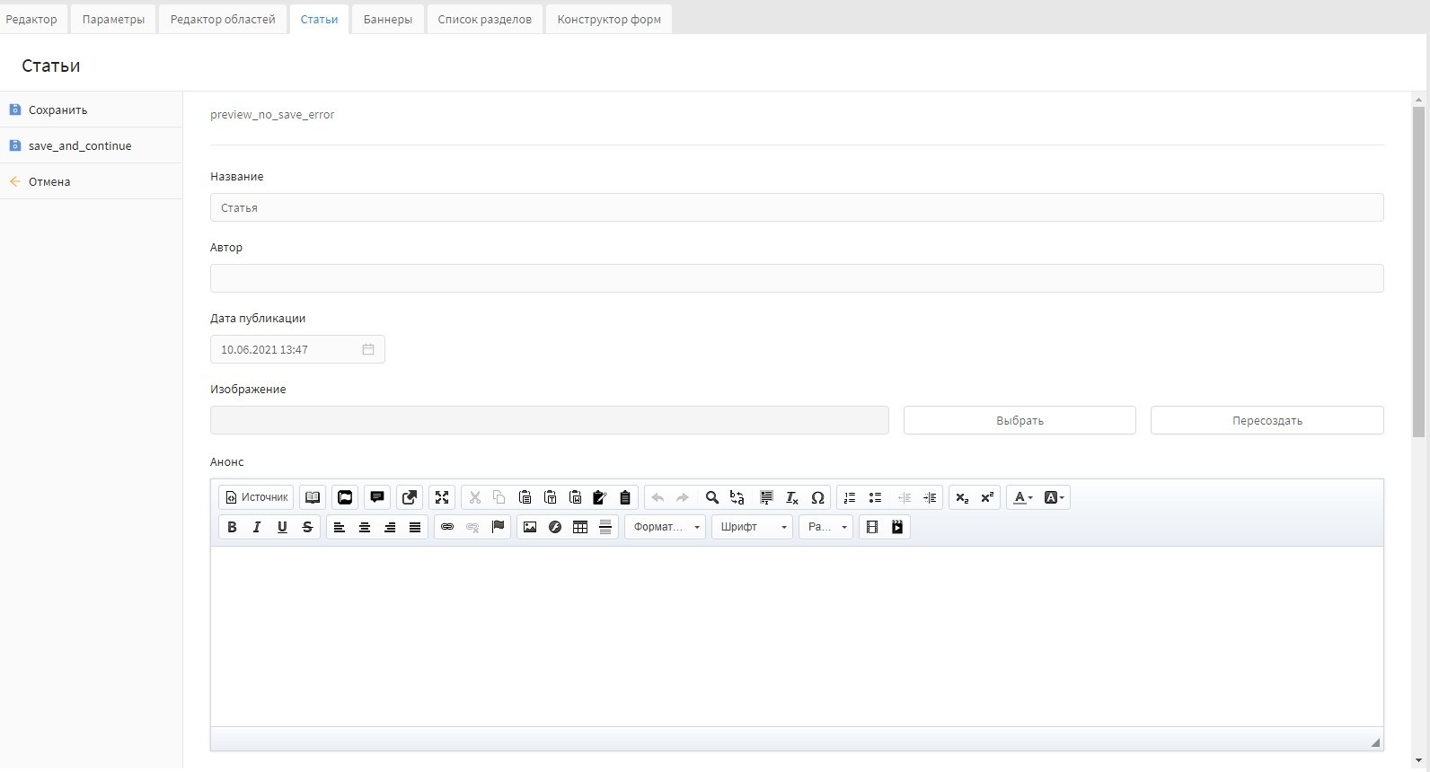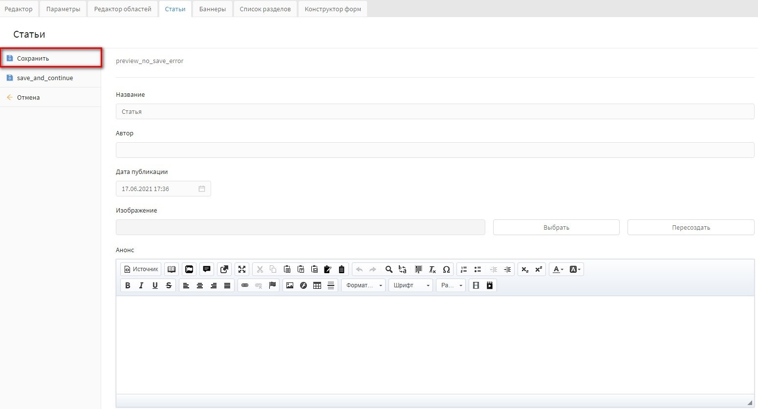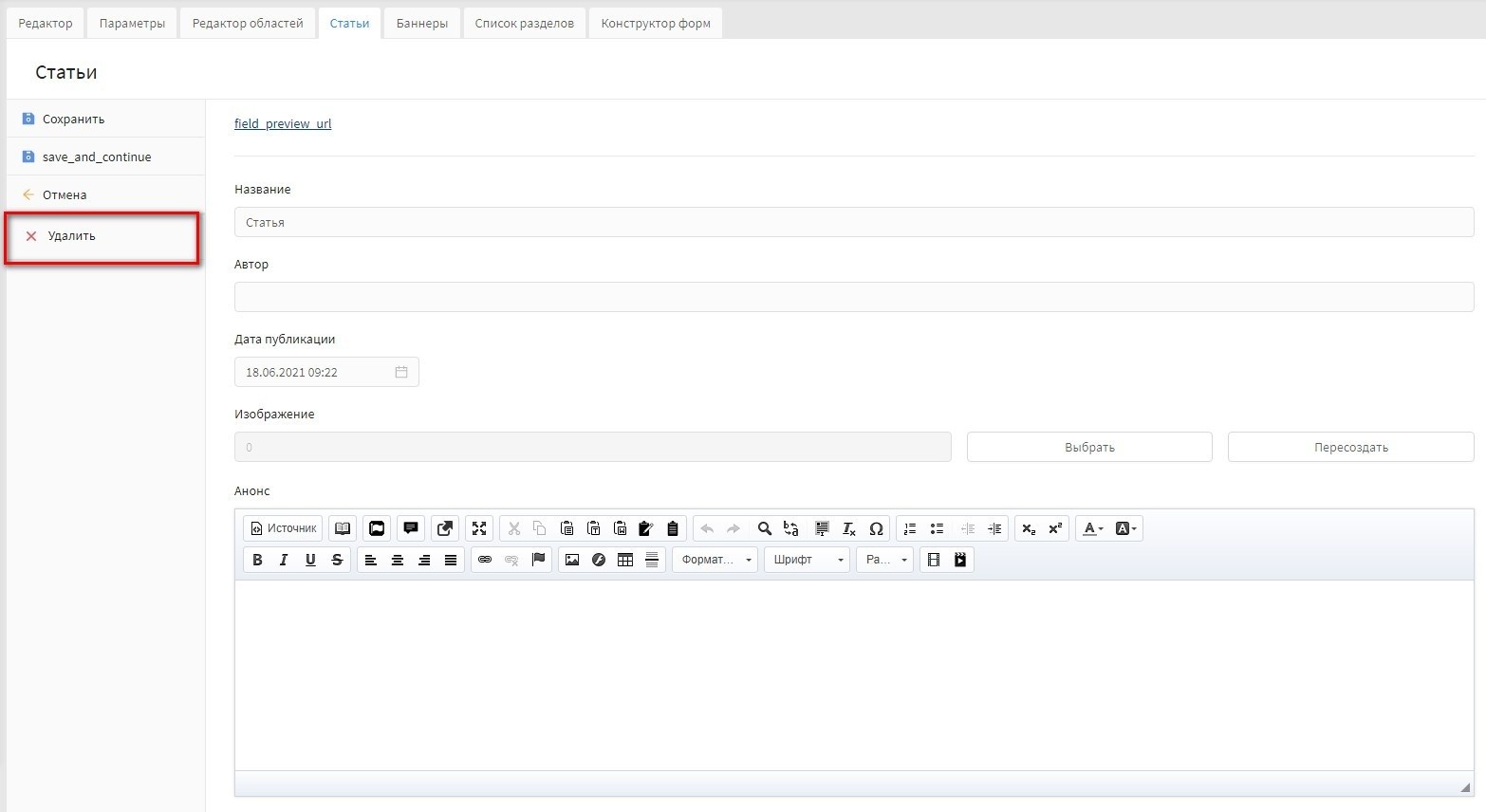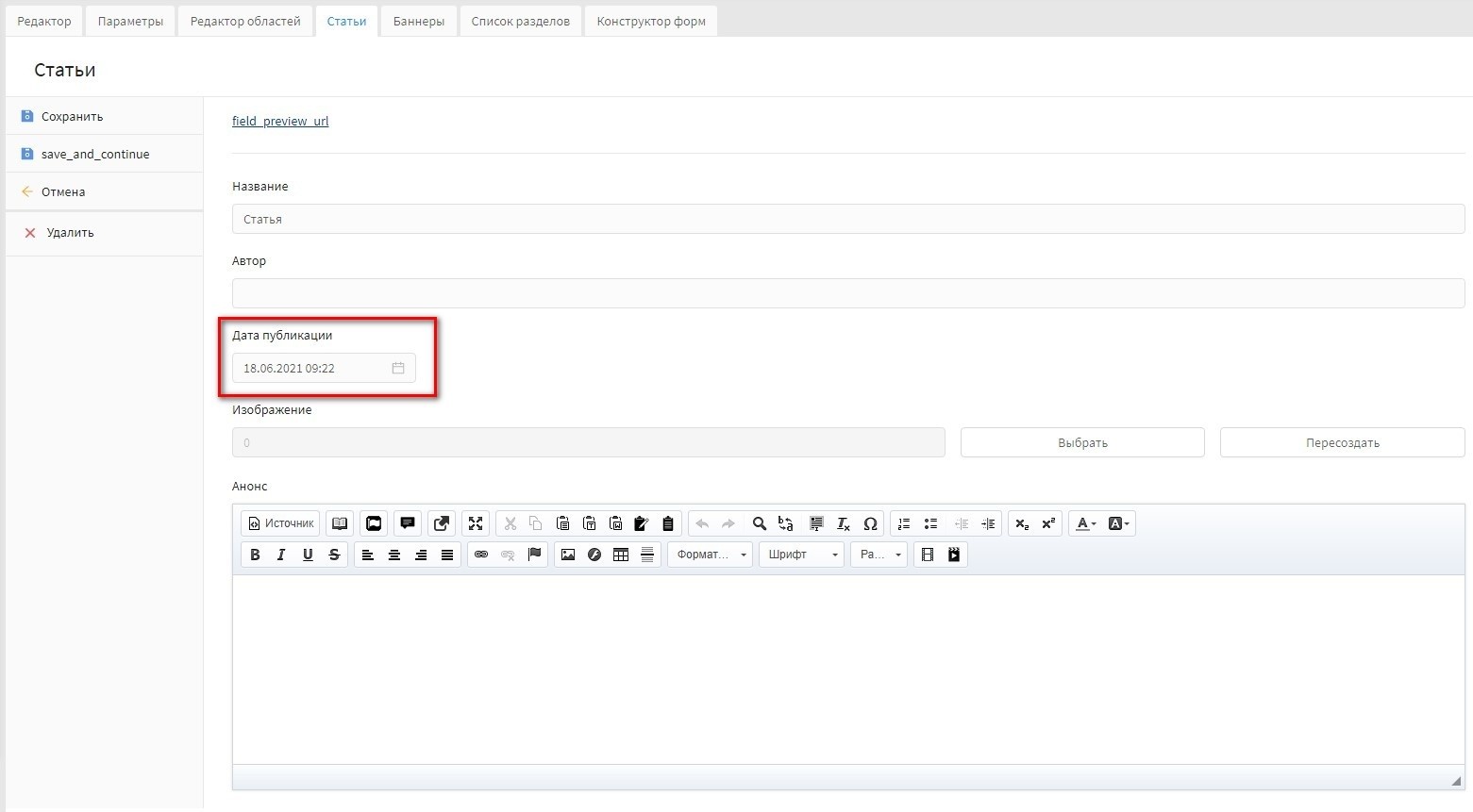"Анонс" - поле предназначено для ввода краткого описания статьи. Текст выводится в списке статьей, как в разделе статей, так и в разделе "Главная".