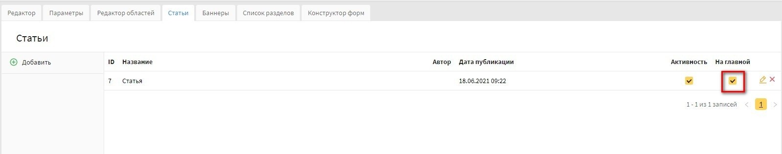 колонка "На главной" - в данной колонке выводится параметр "На главной". Галочку можно редактировать в списке, при ее установке статья выводится в разделе "Главная".