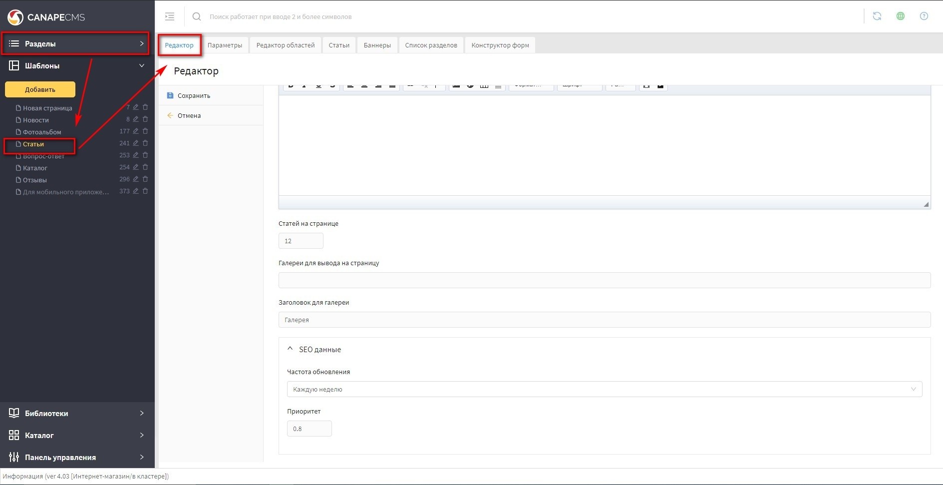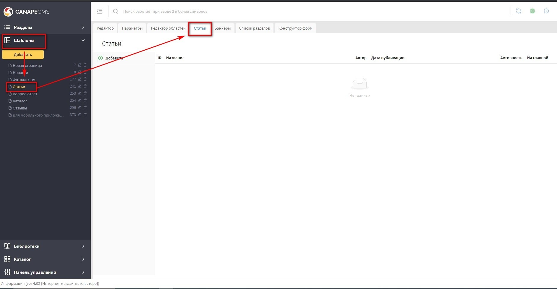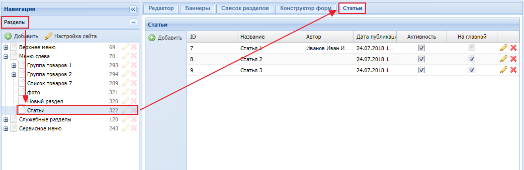 в панели "Разделы" найдите раздел типа "Статьи", нажмите на него и в правой части откройте панель "Статьи". Скриншот