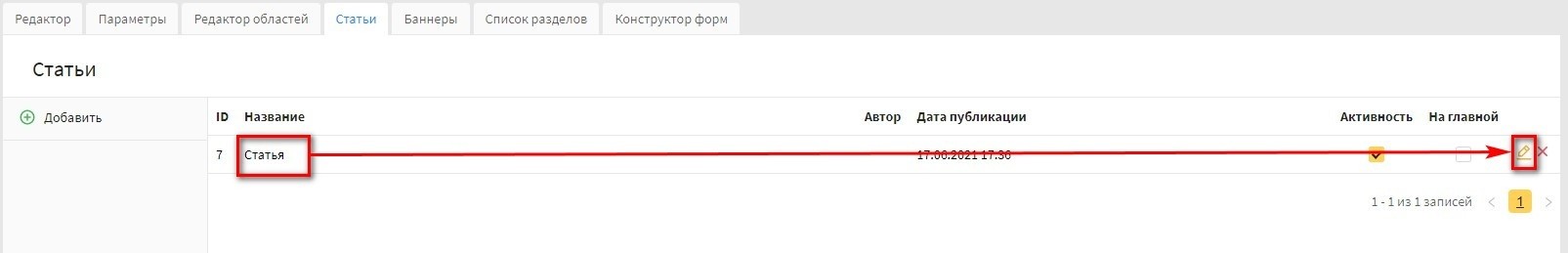 в панели "Статьи" нажмите иконку "Редактировать" у нужной статьи. Скриншот