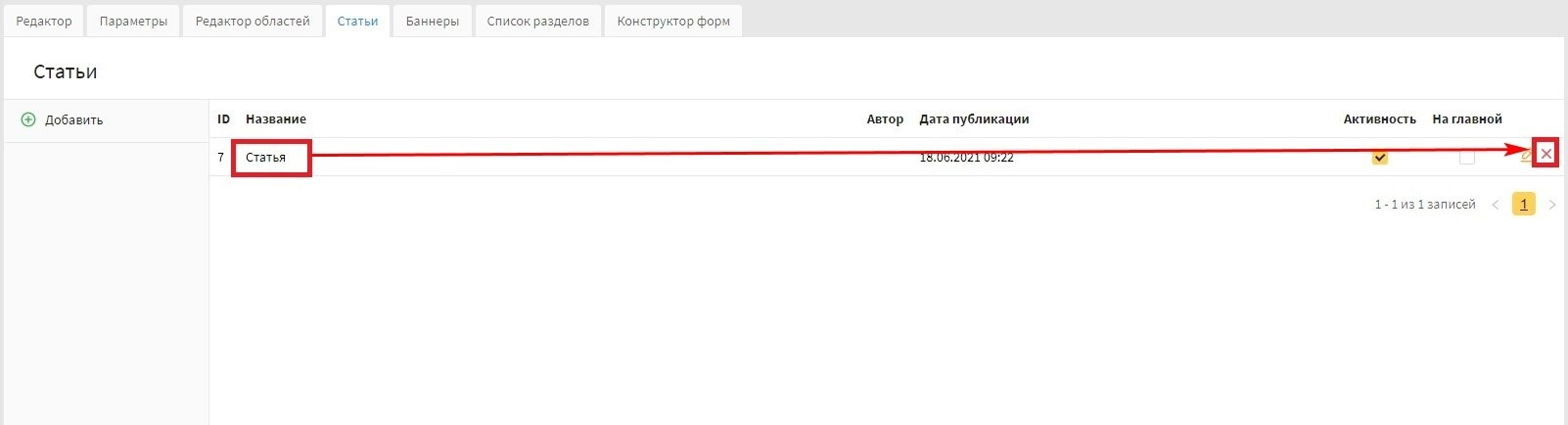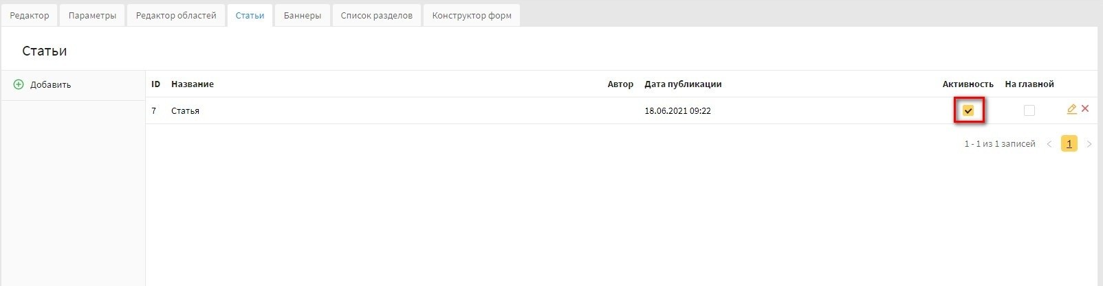 колонка "Активность" - в данной колонке выводится параметр "Активность". Галочку можно редактировать в списке, при ее установке статья выводится на сайте.
